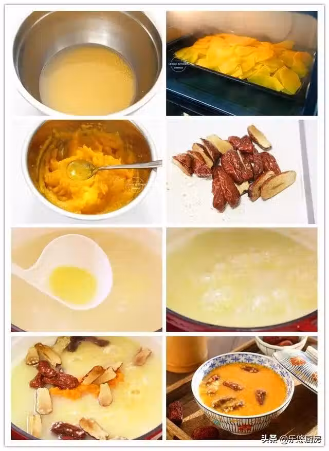 第七步:煮至米粒快成熟時,把南瓜泥、紅棗、冰糖放入鍋中,小火再煮十幾分鐘,粥就煮好了。中途要多攪動幾次,避免糊底。