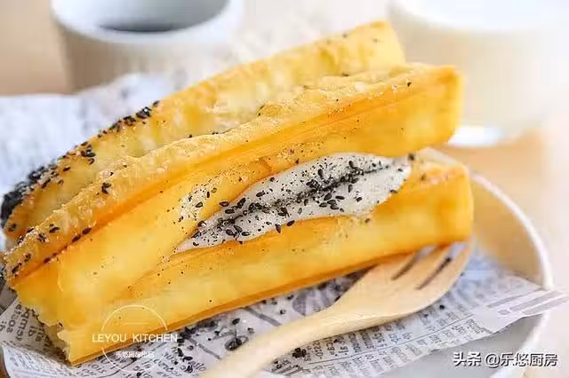 4、油條,現炸的搭配麻糍口感更好哦。之前與大家分享過油條的做法,所以今天就不多說了,大家可以直接點擊下方的圖片,是無泡打粉油條的做法哦~