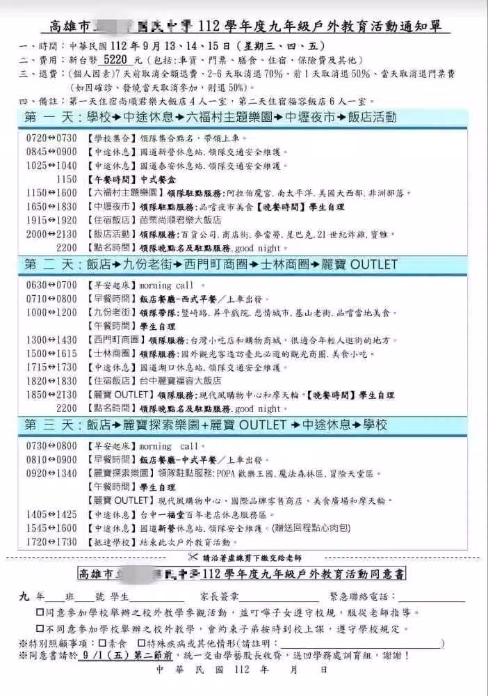 3天畢業旅行5220元!家長怒PO行程「午晚餐全自理、整天買買買」 家長氣炸