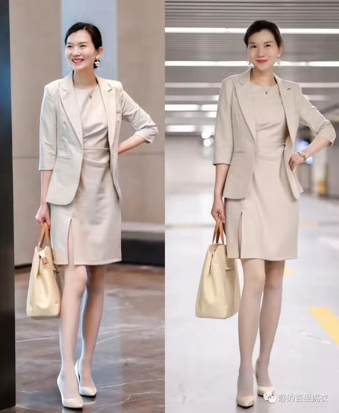 比較經典基礎的高跟鞋,素雅的配色正好在視覺上呼應了服裝,增強了造型整體感的表現力。