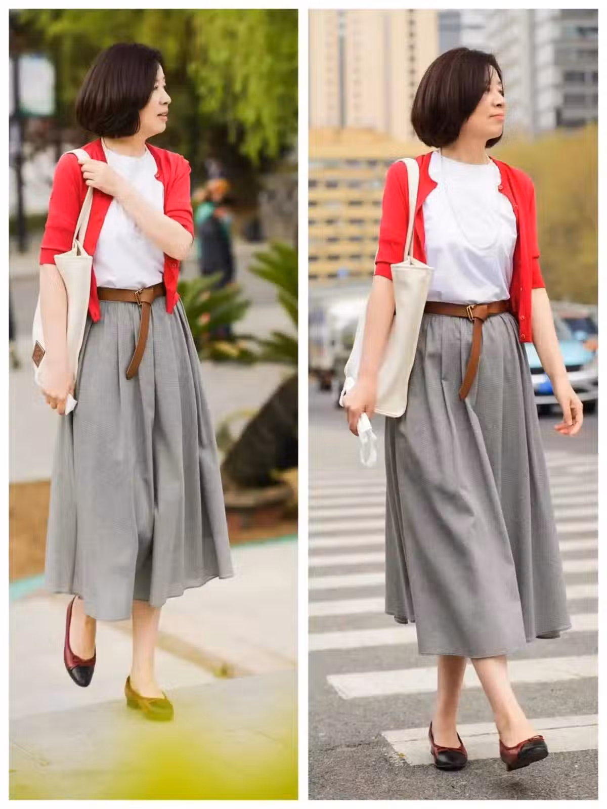 如果不喜歡亮色系的款式,還可以搭配淺色系款式,比如灰色的白色半身裙,搭配亮色的上衣和基礎色的包包,可以讓風格變得更有亮點,體現出高級魅力。