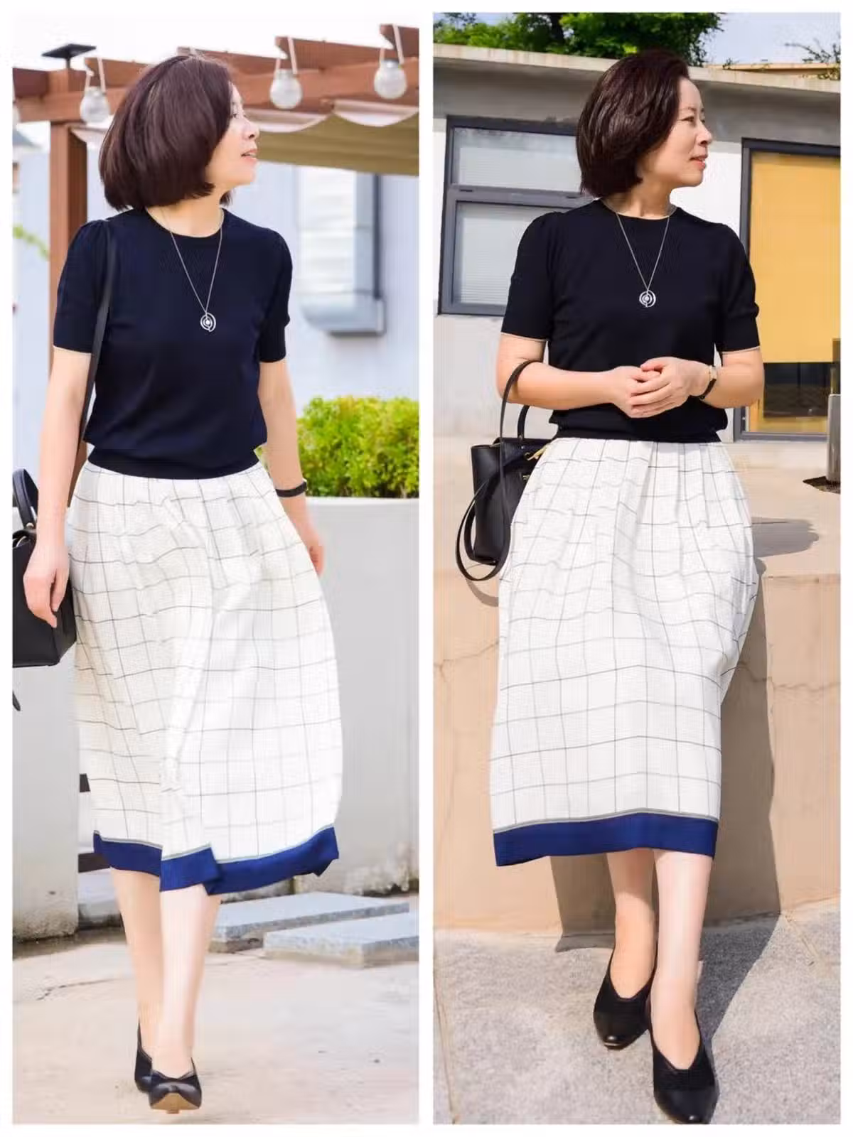 50歲別總穿緊身褲,學這位阿姨百褶半裙搭配,優雅氣質又大方