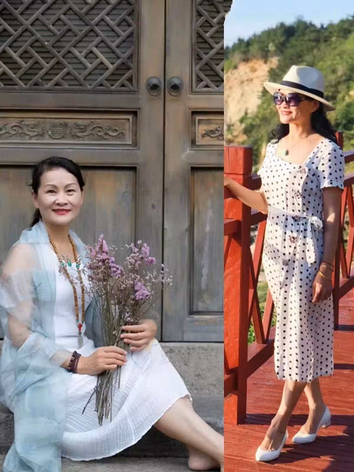 此外,連衣長裙的款式要簡約淡雅一點,只有這類裙裝才能凸顯媽媽輩們的好氣質。比如小白裙,或者白底小黑波收腰連衣長裙,都蠻經典的。