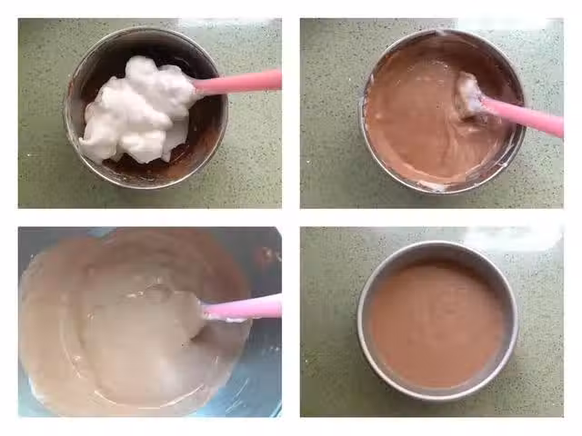 5、烤箱提前200度預熱10分鐘,將模具放入烤箱中下層,上下火160度烤40-45分鐘,烤好後將蛋糕迅速從烤箱內取出來,震幾下震出熱氣,然後再迅速倒扣在網架上晾涼,等完全晾涼後再進行脫模。蛋糕晾涼之後切成三片,將提前打發好的淡奶油均勻地抹在蛋糕胚上,最後再表面篩上一層可可粉,再放上水果就可以了。
