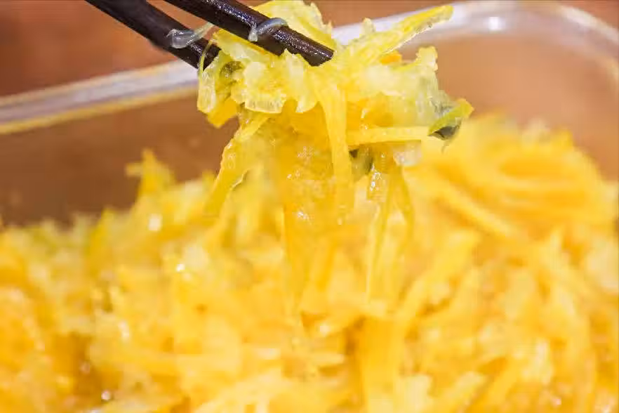 1.準備一個新鮮的柚子,用食鹽把柚子皮搓洗一遍,然後用清水沖洗乾淨,把柚子黃色的表皮全部刮下來。