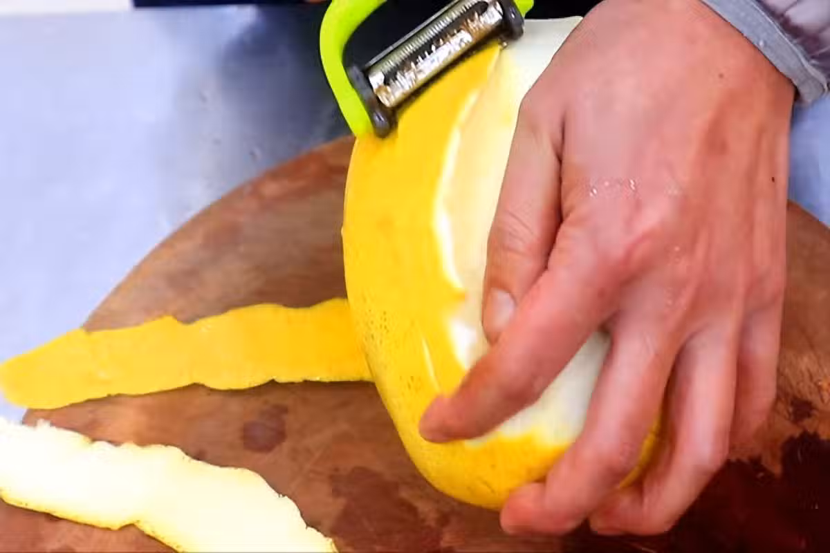 2.再把柚子皮切成細絲,切的越細越好;果肉剝出來掰成塊,再準備適量的冰糖備用。