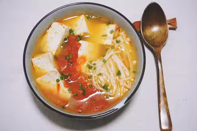 準備工作:提前將番茄洗凈,切片。金針菇洗凈分散開來。豆腐切成小塊狀。
