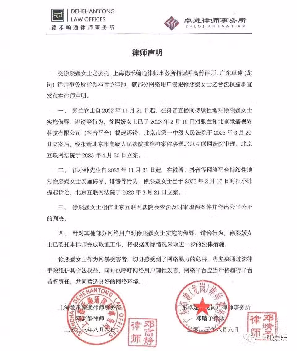 聲明中表示,大S已經在2023年的2月16日,分別起訴了張蘭、汪小菲,理由是侮辱、誹謗。