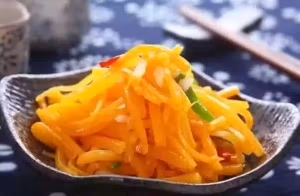 2、炒鍋上火,放入菜油燒熱後,倒入南瓜絲,用旺火速炒2~3分鐘,撒上鹽、顛翻炒勻,出鍋即成。