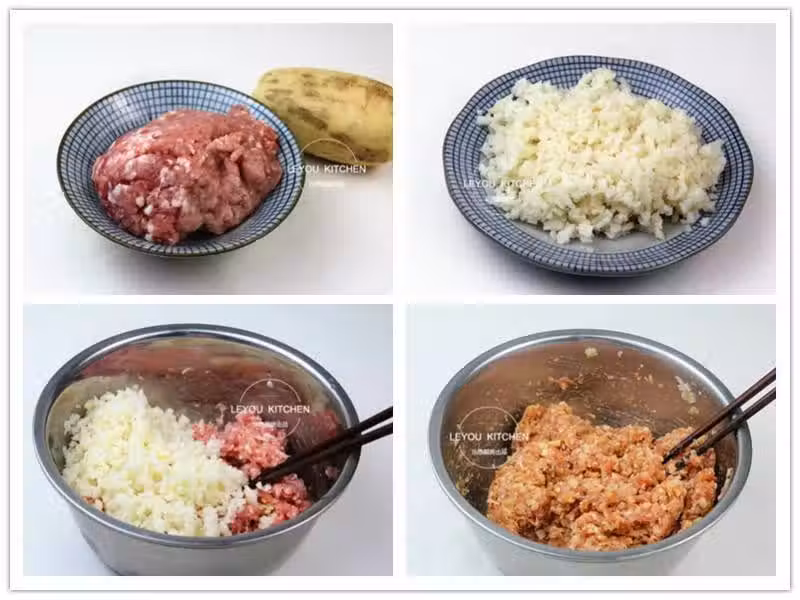 第三步:把蓮藕、肉餡、薑末放盆中,然後再依次放入1個蛋清、半勺老抽、2勺生抽、1勺蚝油、半勺鹽、半勺雞精、少許水澱粉、少許香油。