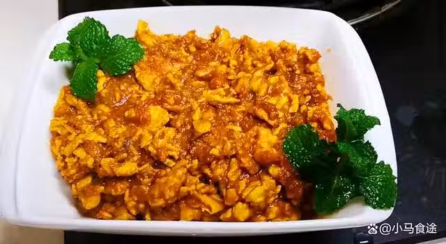 2.再起鍋燒油,下入蔥花爆一下香味,下入一勺東北大醬,小火炒香,下入炒熟的雞蛋,炒勻即可出鍋裝盤。