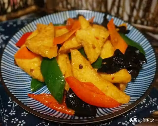 滷水豆腐1塊、柿子椒半個、豆瓣醬2勺、白糖1勺、姜少許、胡蘿蔔半根、木耳8朵、鹽1克、水澱粉少許。
