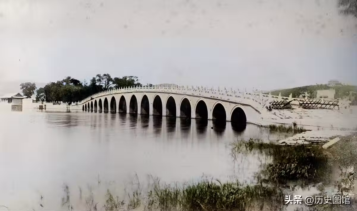 這是晚清時期的十七孔橋。該橋全長150米,有17個拱形橋孔。橋身造型優美,橋洞與水中的倒影相映成趣,是頤和園著名的景點之一。橋上雕刻有500多隻石獅子,比盧溝橋的石獅子還多。