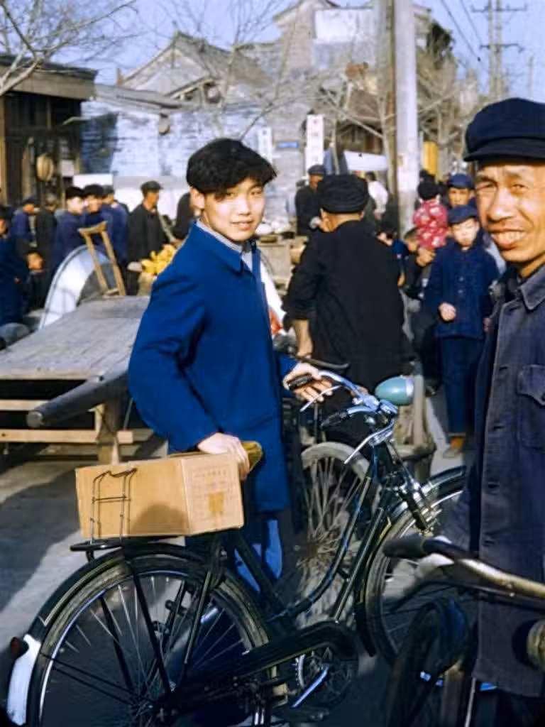 自行車在晚清時期就進入中國,但一直到民國時期都未普及,只有在上海等口岸城市才有。圖為1959年的北京街頭,一位騎28寸自行車的中山裝大爺。1950年代,國產飛鴿自行車已經開始生產,但只有經濟條件較好的家庭才擁有。到80年代,自行車終於在全國普及。