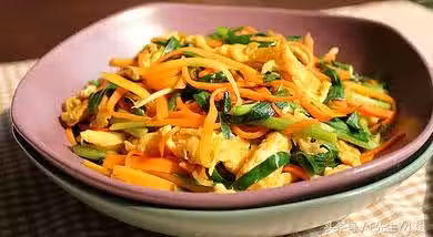 4、平底鍋放稍微多一點的花生油,油熱後倒入雞蛋液,快速劃散;放切好的胡蘿蔔絲進去,中火翻炒至胡蘿蔔絲變軟。