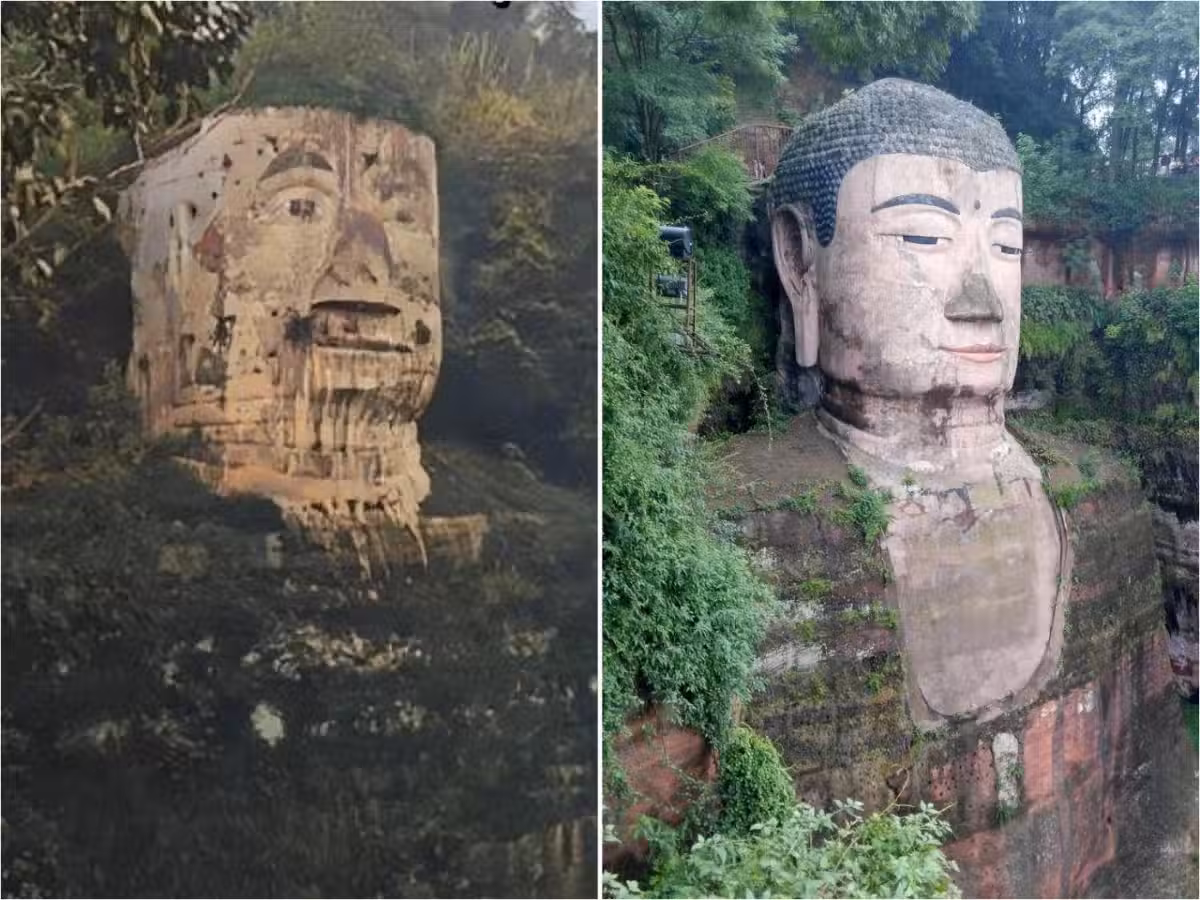 當時的大佛,「頭髮」還很長,渾身長滿了雜草青苔,而且表情和現在大不相同,看起來非常的「懵逼」…