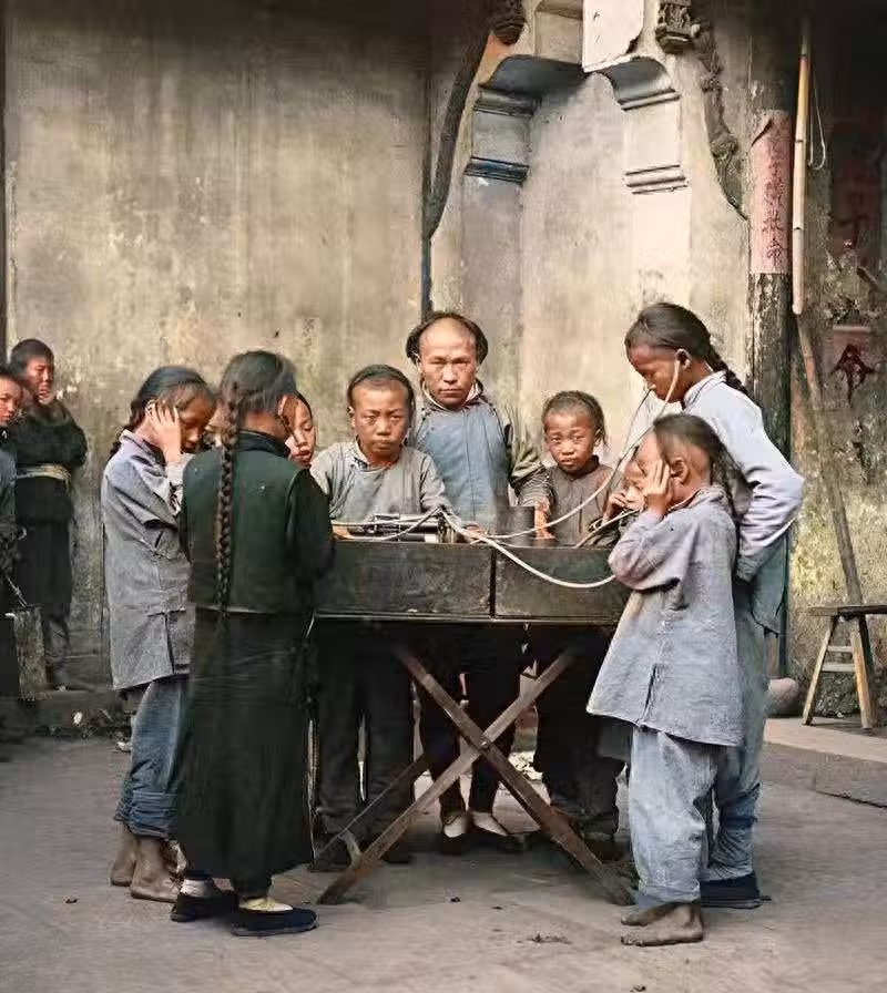 清朝時期,人們也能經常見到一些新鮮玩意。照片中這幾名小孩,正站街邊一個桌子邊。在他們面前,擺放著兩台留聲機。他們將聽筒塞進耳朵里,優美的音樂就響了起來。