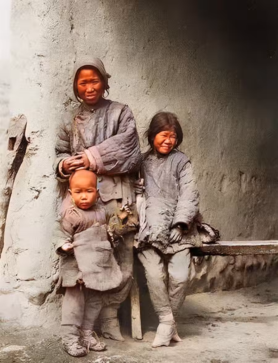 看了上面這些有工作的人,也有生活在溫飽線下的窮苦人。照片中母子三人,站在土房子前。他們身上穿的棉衣破破爛爛,根本就不能禦寒。