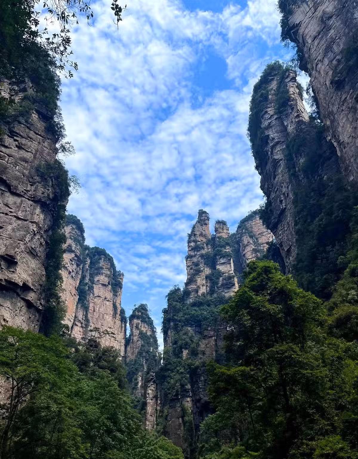 藍天白雲之下,一個個柱子似的山峰錯落有致的屹立在大地之上,綠樹和植被裝扮點綴著山峰,讓它們看起來綠茸茸的。