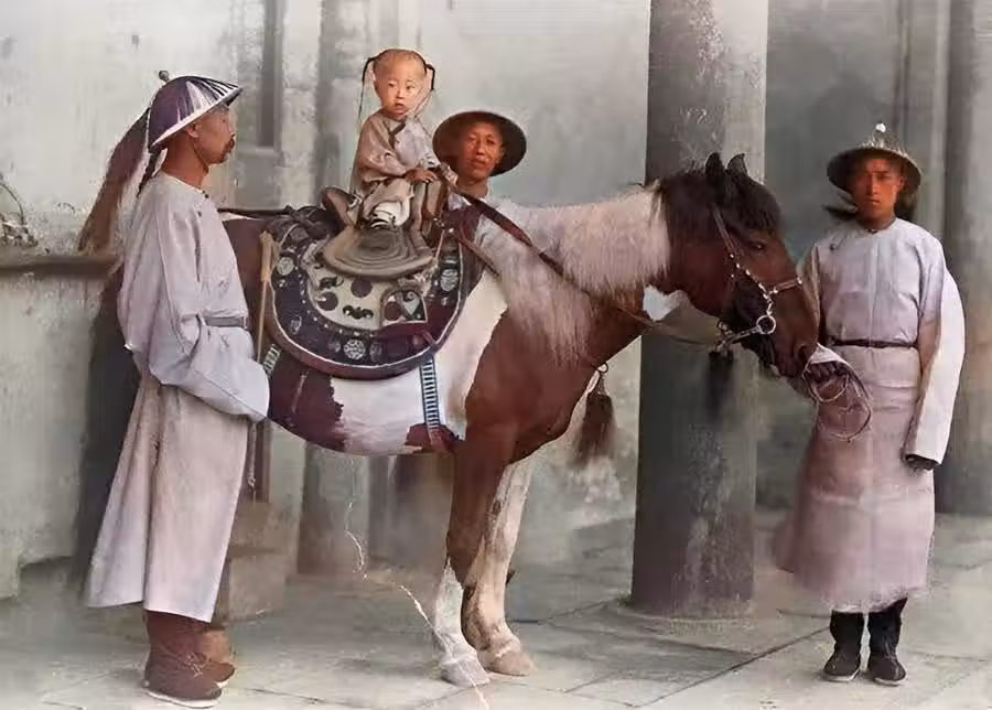 皇宮里,一名太監牽著馬,另外兩名太監在旁邊照護。馬背上坐著一個小孩,他就是愛新覺羅溥儀。一兩歲的溥儀在太監的照看下,手牽韁繩坐在馬鞍上拍照。