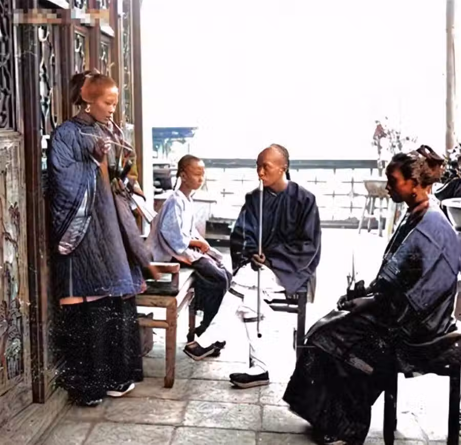 當地一名鄉紳和家人在房前休息。男子家境不錯,寬宅大院,地面鋪著方磚。花盆裡鮮花開得正艷。