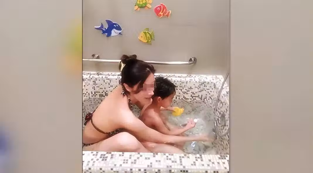 從照片來看,兒子已經七八歲了,而李嘉欣則是身穿泳衣,和兒子一起坐在浴缸里陪兒子洗澡。