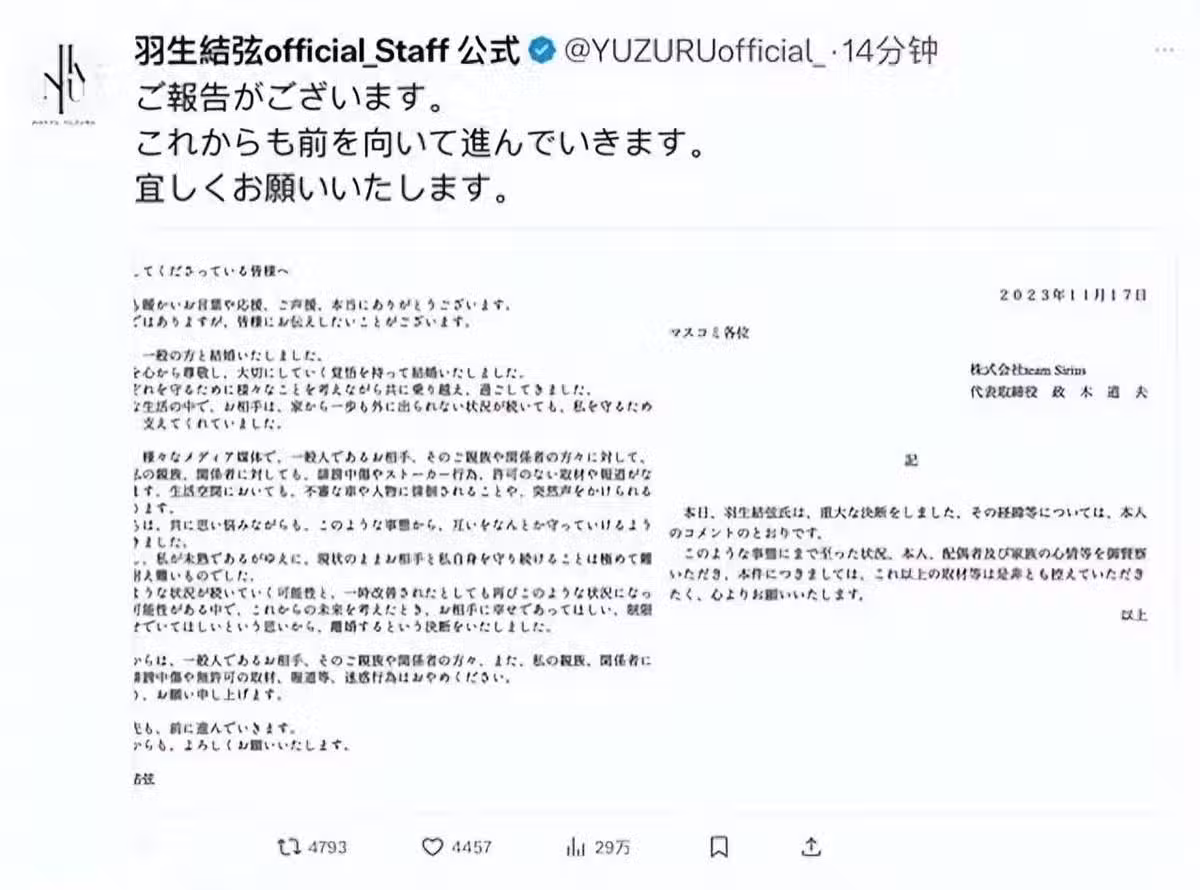 11月17日晚,日本兩屆花滑冬奧冠軍羽生結弦在結婚僅3個月之後,官宣失婚!他通過官方社交媒體發布了聲明,並且透露了失婚的原因