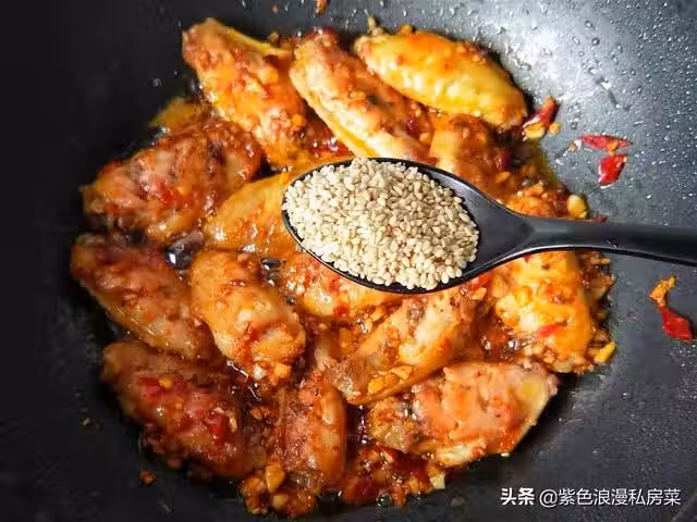 8.放一勺白芝麻,翻炒均勻,使每一個雞翅都裹滿佐料。