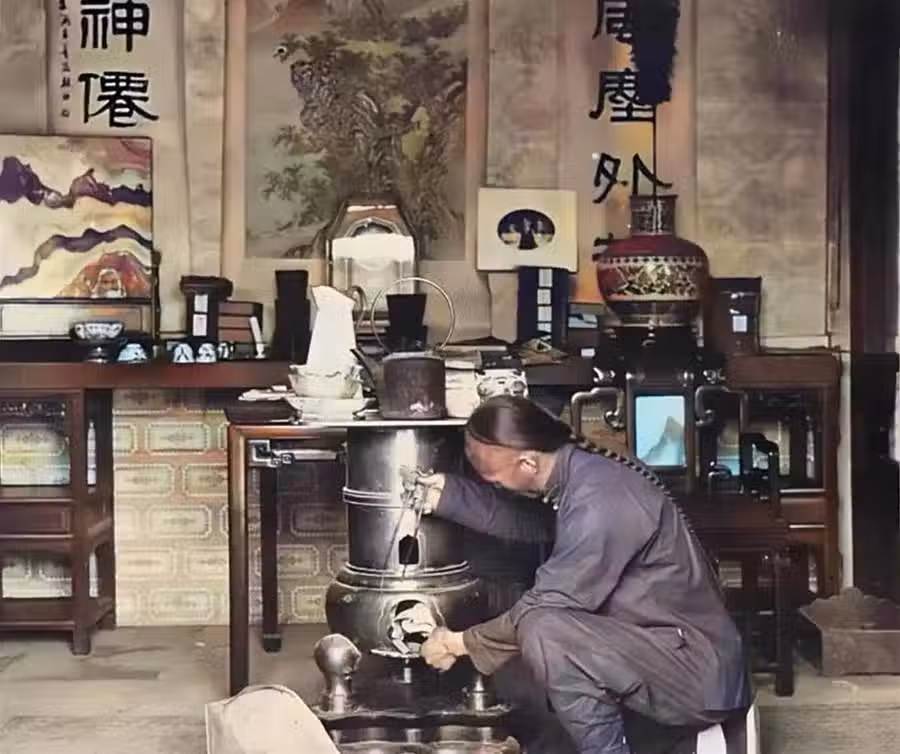 專職燒水的僕人,正在捯飭火爐。越是大戶人家,僕人分工越明確。有人打掃庭院,有人專職燒水。看他的衣著打扮,還有敞亮房子,條案上還有西洋鐘,應該是開明的紳士之家。這爐子也是高大上,上面的茶壺放到今天都是一件工藝品了吧!