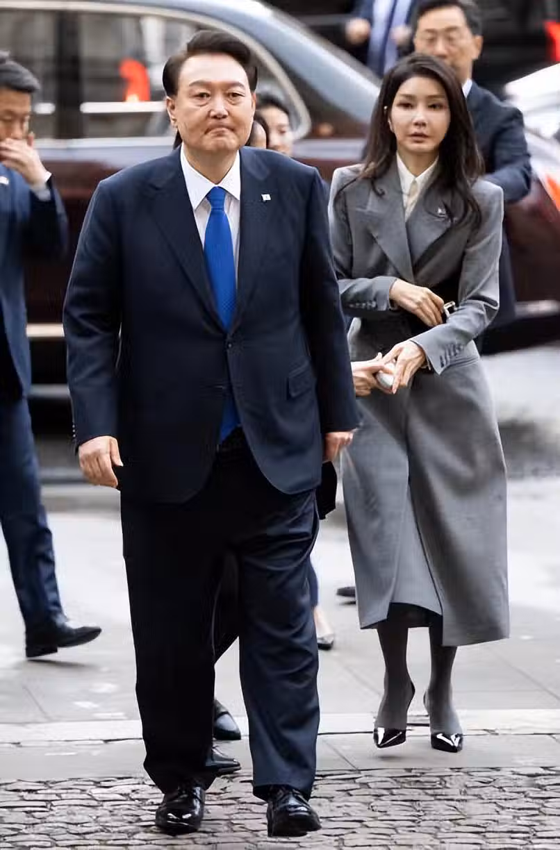 韓國總統夫婦還去了威斯敏斯特教堂,金建希的這身花灰色的造型,如果沒有和凱特同框比美的話,氣質還是非常贊的。