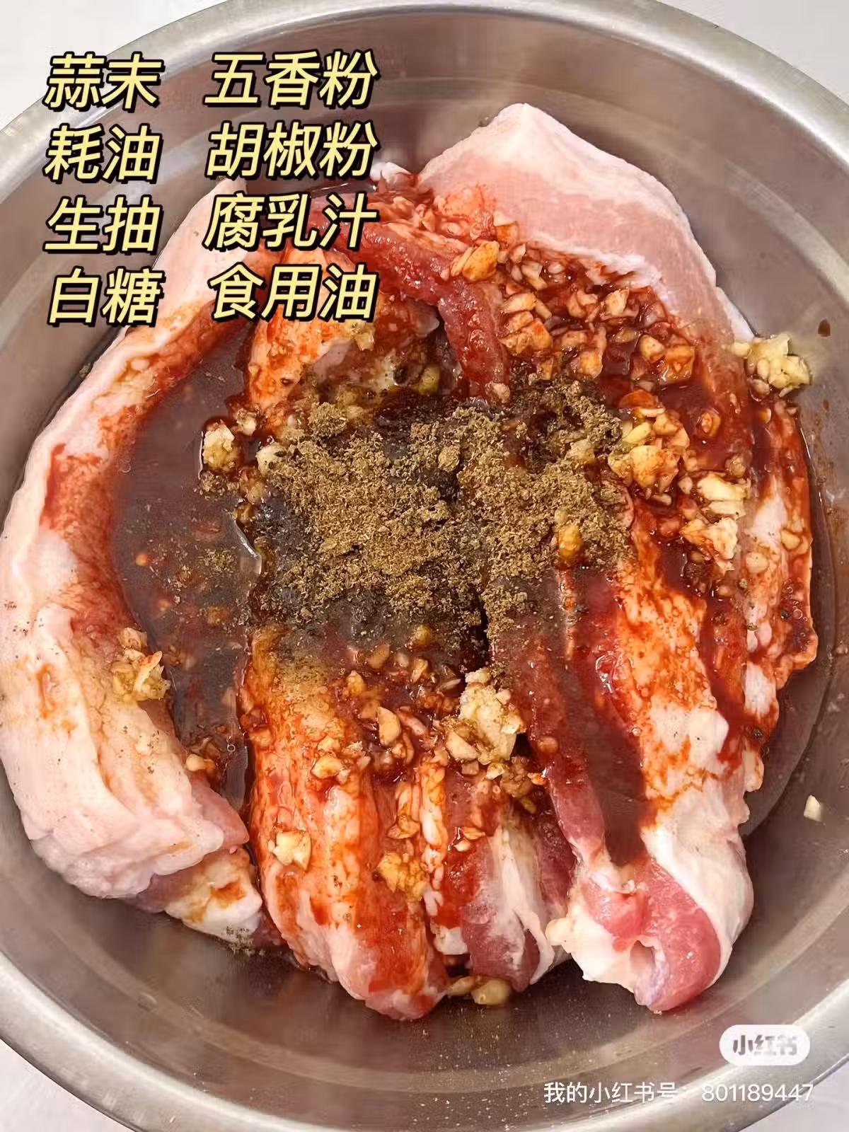 1️⃣豬肉不用切,用食用油、南乳汁、五香粉、胡椒粉、耗油、生抽、白糖腌制過夜