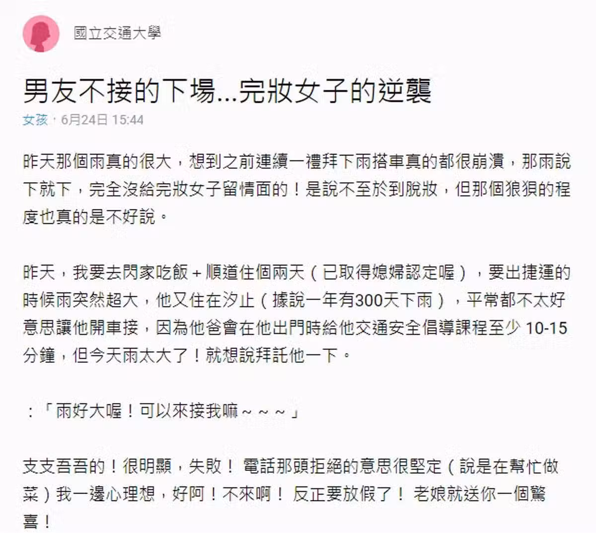 一名網友在學生論壇 《Dcard》中發文分享自己的經驗,她表示前幾天她受邀到男友家住兩天,而男友剛好住在多雨的汐止,當天踏出捷運站的時候就剛好遇上了超狂的暴雨! 原PO表示自己平時都不太好意思讓男友開車接送,不過那天雨真的太大了,所以她就試探性的打給男友撒嬌: