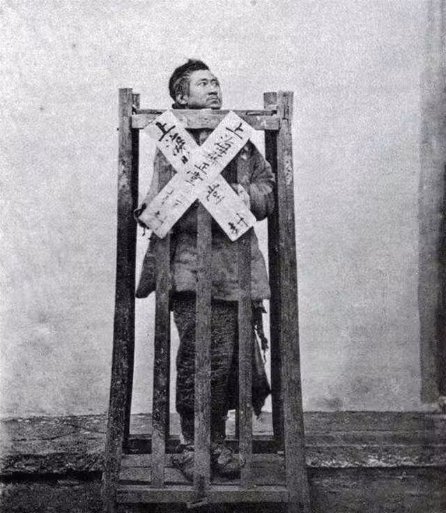 這張圖片拍攝於清朝晚期,是一個犯人被關押在木頭做的籠子裡面的照片,他身穿舊棉布衣,頭望向天空,不知在想些什麼。木牢籠上面還貼著封條,封條上寫著:「上海某正堂封」之類的不甚清晰的讓人難以辨認的字跡,也讓人真正的見識到了清朝晚期的犯人和囚牢是什麼樣子。