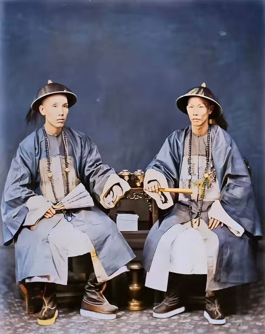 照片中是兩名年輕的政府官員,兩個穿著整齊的官服,戴著官帽和朝珠,或許是因為自恃身份的原因,兩個人的表情都非常的嚴肅。