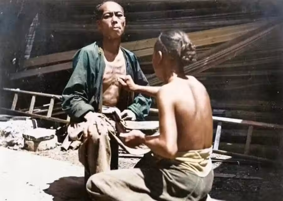 在一個木材加工坊內,一名工人正在幫助工友用土辦法緩解著胸口的疼痛,當時的普通百姓如果有了一些頭疼腦熱的時候,一般都會用偏方或是土法來進行解決,畢竟去醫館看病是要花錢的。