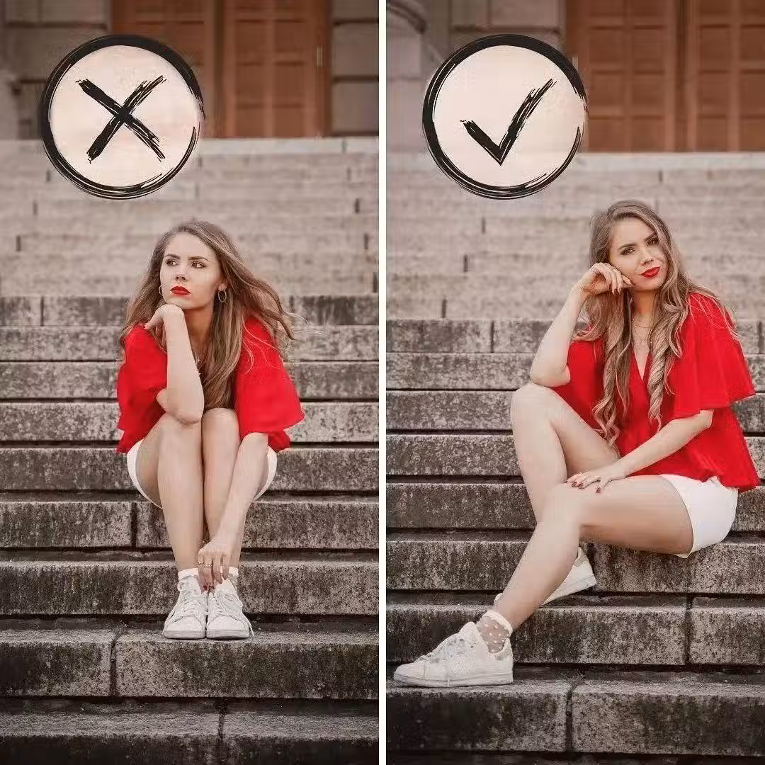 坐在樓梯拍照,也不要讓自己正正的對著鏡頭拍,盡量讓自己側坐著,一隻腳往對角伸出去,一手放腿上,一手撐著臉,很慵懶自然、顯腿長,美美的。