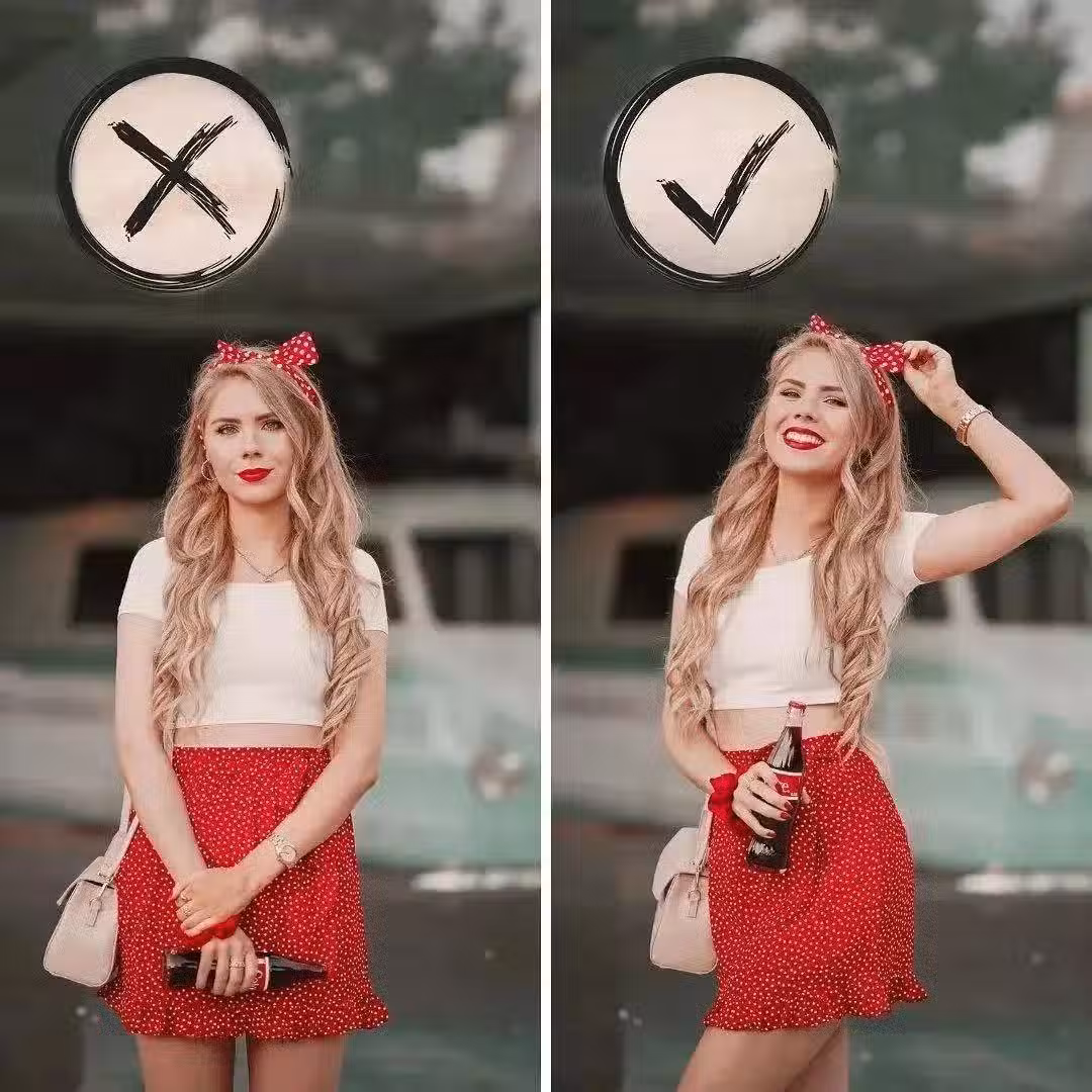 拍半身照的時候,不要手放在一起去擺拍,不要不顯身材,可以讓自己一手放著,一手抬起來,抬頭挺胸微笑起來,很自然很顯身材,很漂亮。
