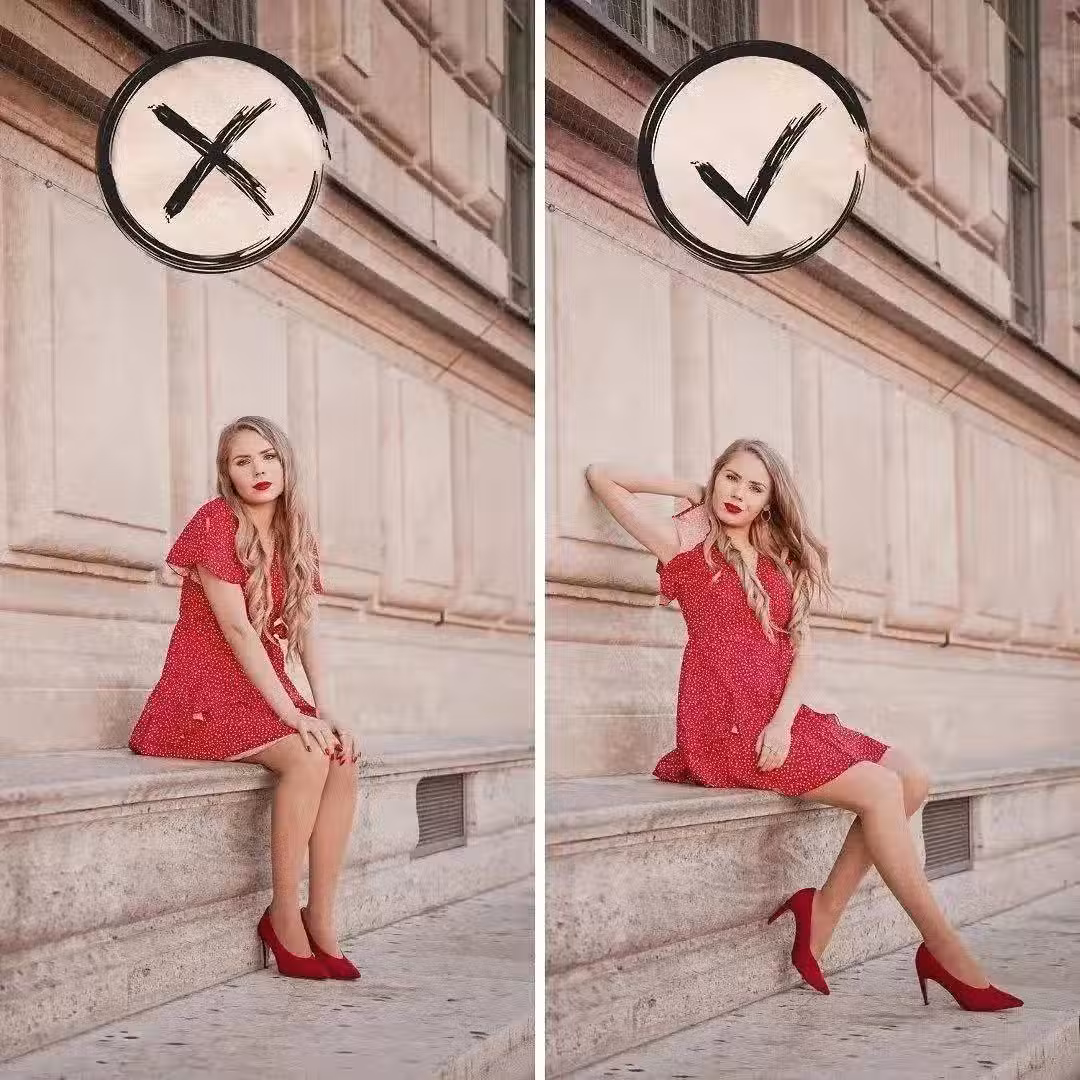 側坐著拍照的話,別把兩只腳都收起來,這樣顯得身材不好看,可以讓自己側坐著,一隻腳往內收,一隻腳自然伸出去,手也可以動起來,這樣拍照自然又腿長。