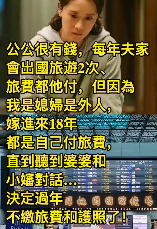公公很有錢,每年夫家會出國旅遊2次、旅費都他付,但因為我是媳婦是外人,嫁進來18年都是自己付旅費,直到聽到婆婆和小嬸對話…決定過年不繳旅費和護照了!