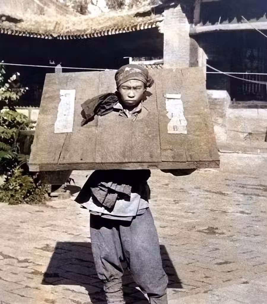 好傢夥,這是犯了什麼樣的大罪,怎麼會套上這麼重的枷鎖?感覺這個枷鎖得有幾十斤重, 這個枷鎖戴著一會就難受,別說戴很長時間了。