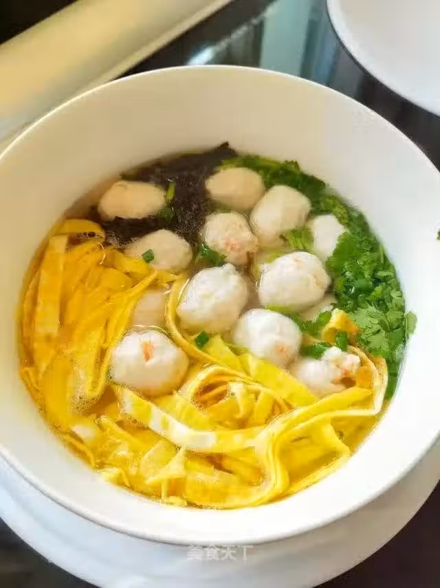 蝦滑丸冷水下鍋,煮開趁熱淋入備好配料的湯碗中。