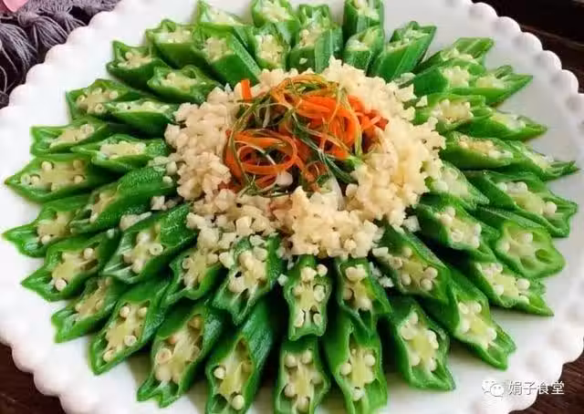 5、將煮熟的秋葵,依次擺入盤中,再放入蒜末、紅椒絲、小蔥,再淋入調好的白灼汁,再淋入一勺熱油,激發出香味即可。
