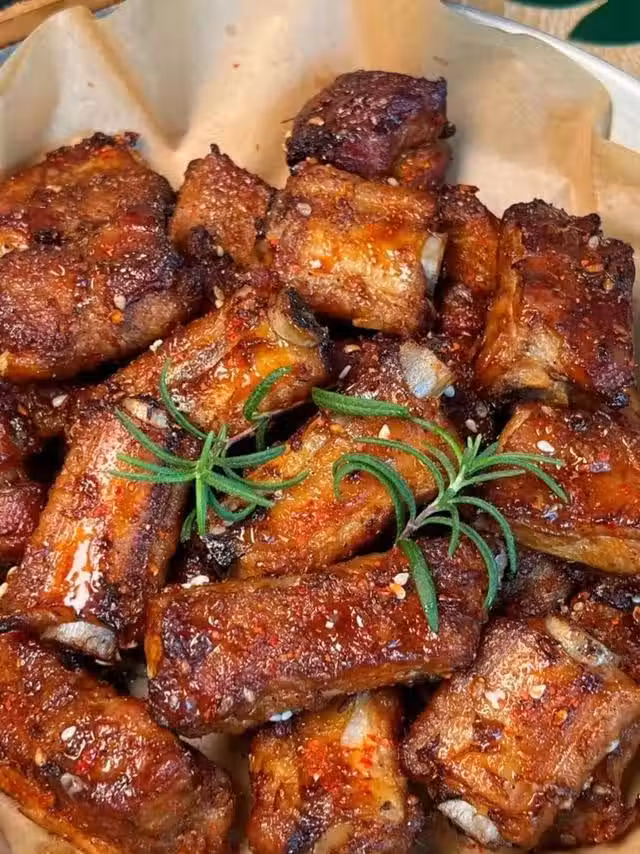 2.腌制好的排骨擺好在空氣炸鍋炸籃上,調整溫度和時間,200度 25分鐘即可,中途不用翻面烤好撒上辣椒麵和椒鹽就可以吃!