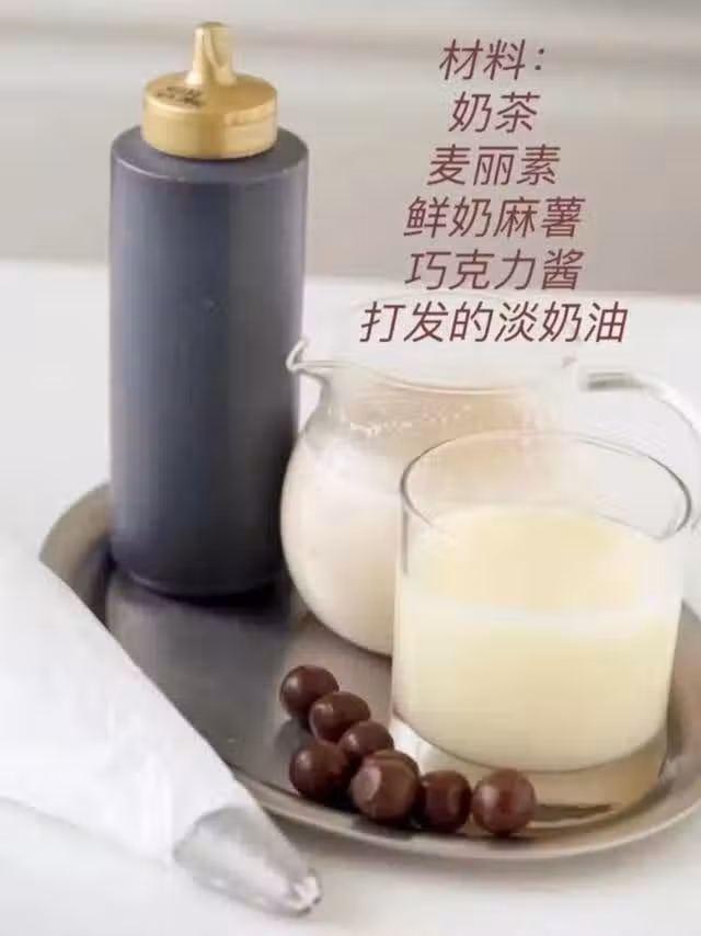 ①杯中放鮮奶麻薯巧克力醬掛壁,牛乳茶