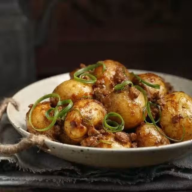 原料:小土豆500克、肉末150克、香蔥80克、油2匙、鹽、生抽1匙、糖、黑花椒粉、姜。