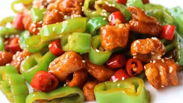 4.放入尖椒段,加入生抽,老抽,鹽,和少許白糖,大火翻炒均勻,尖椒變軟就可以關火了。