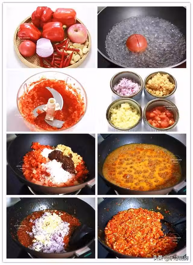 第五步:開小火,把辣椒碎、蘋果碎、西紅柿碎放入鍋中,再依次放入80克白糖、80毫升白醋、60克鹽、100克豆瓣醬,如圖。