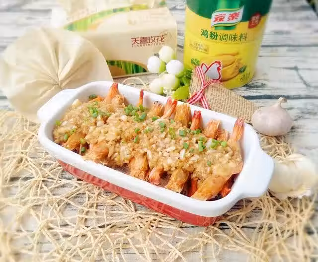 4.把蝦放在粉絲上面,澆上蒜蓉,水熱了放蝦蒸 大火10分鐘,最後撒上蔥花就ok啦~