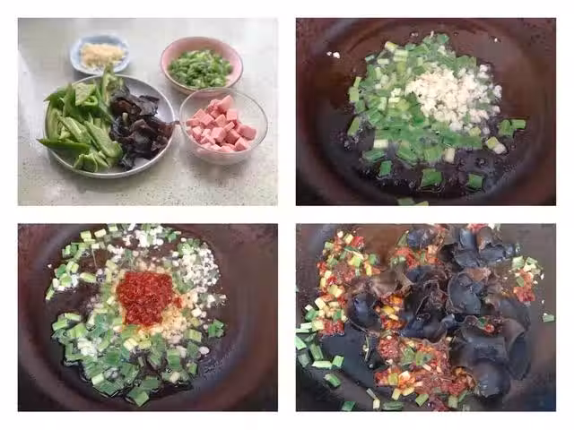 第三步:木耳放入後翻炒一會,接著倒入適量的溫水,加入適量的鹽,燒開後加入煎好的豆腐和青椒翻炒均勻,青椒稍稍變色後,加入午餐肉丁翻炒均勻,取一個小碗倒入澱粉,加入少許的清水調製成水澱粉,將調好的水澱粉倒入鍋中翻炒均勻即可關火。