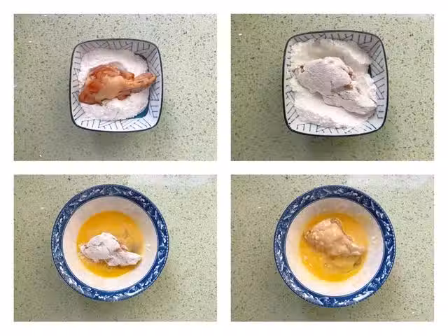 第三步:裹好蛋液的雞腿再放入麵包糠中,均勻地裹上麵包糠,將裹好麵包糠的雞腿放入盤中備用,油燒至五成熱,放入雞腿,中小火炸制雞腿金黃,撈出來瀝油,稍微涼至溫熱即可食用。這裡如何判斷油溫是不是五成熱呢,可以取一根筷子放入油中,筷子周圍冒出許多小氣泡,則表示油溫差不多五成熱了。